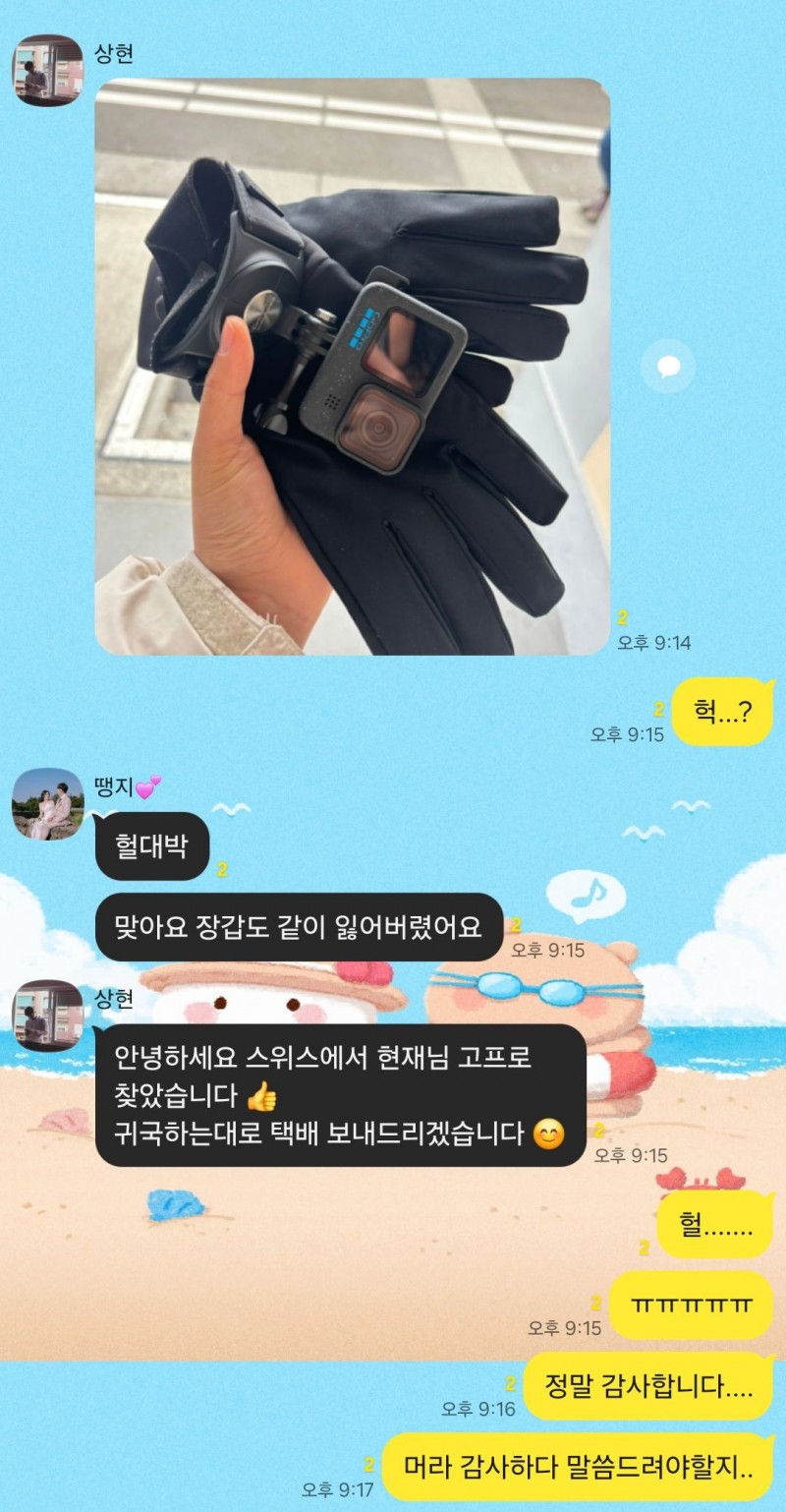 매니저님 한분께서 고프로와 장갑 모두 찾았다고 연락을 주셨습니다.